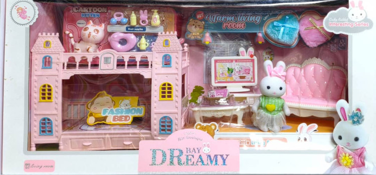 شامل عروسک خرگوش، مبل صورتی، میز، کامپیوتر، تخت دوطبقه و اکسسوریهای کیوت. مناسب بازیهای نقشآفرینی و تقویت خلاقیت کودک با طراحی لطیف و دخترونه.